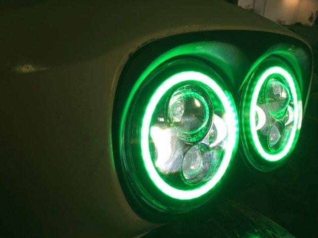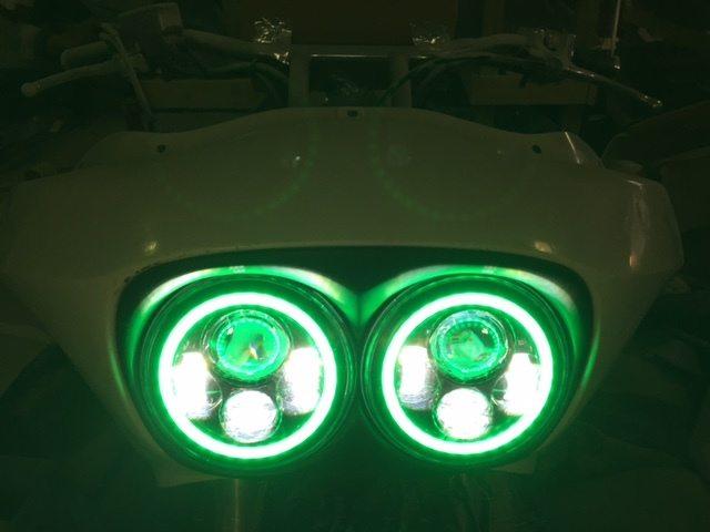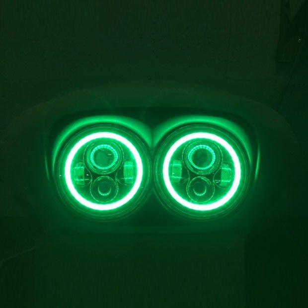 DUAL 7" BLACK PROJECTOR HARLEY DAVIDSON DAYMAKER LED HEADLIGHT LAMP FOR THE HARLEY ROAD GLIDE WITH DUAL GREEN HALOS!!! - WILL FIT FROM 1998 TO 2013.